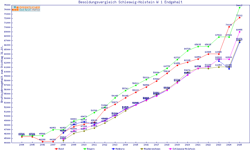 | Besoldungsvergleich W 1 im Jahr 2025 | gemitteltes Gehalt | ||||||