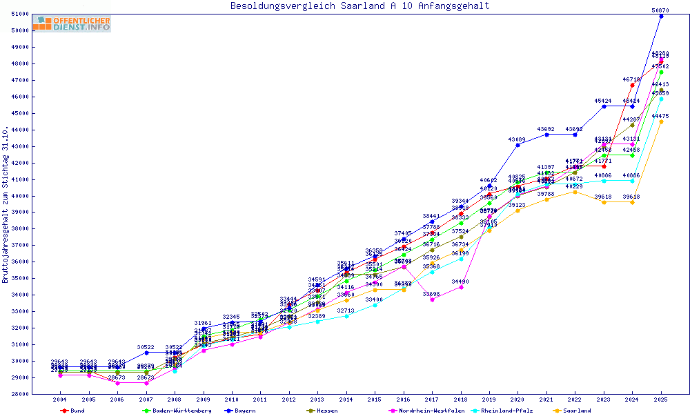 | Besoldungsvergleich A 10 im Jahr 2025 | Anfangsgehalt | ||||||