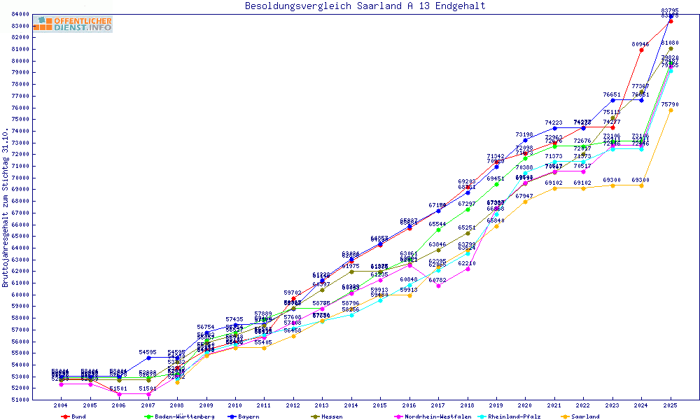 | Bund | 83.375 € | +7584 € | +10.0% | +3285 € | +4.1% | 23 Jahre | ||