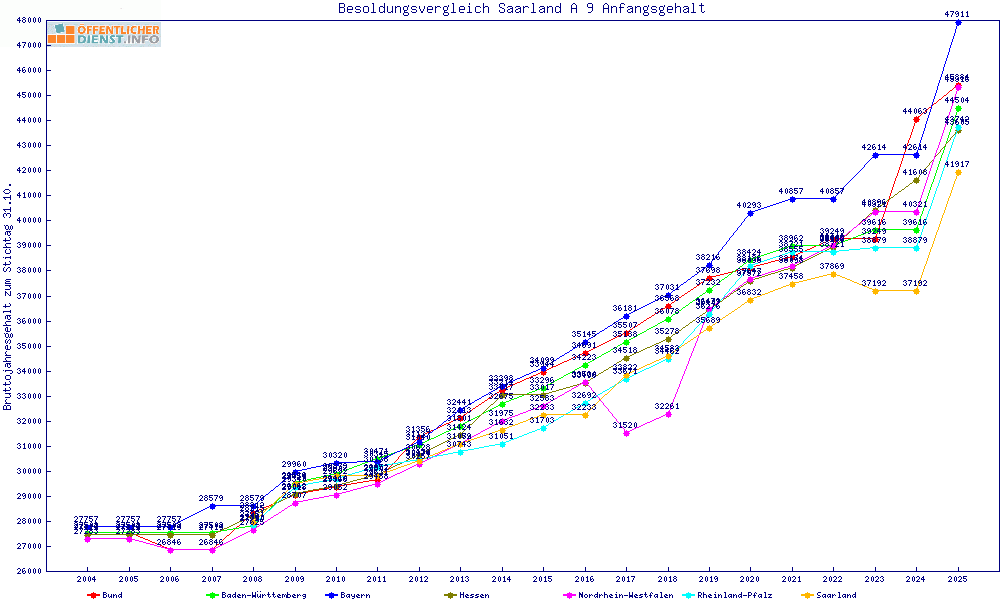 | Besoldungsvergleich A 9 im Jahr 2025 | Anfangsgehalt | ||||||