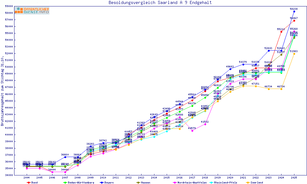 | Bund | 56.868 € | +4884 € | +9.4% | +1713 € | +3.1% | 23 Jahre | ||