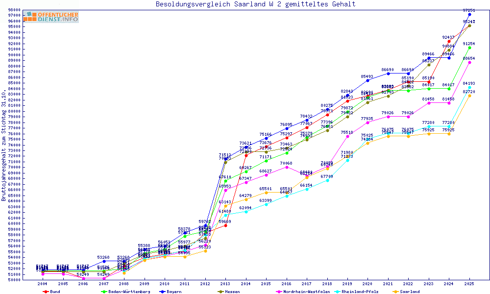 | Besoldungsvergleich W 2 im Jahr 2025 | gemitteltes Gehalt | ||||||