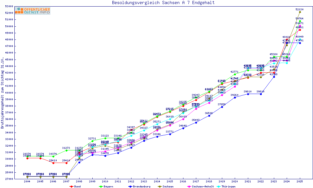 | Sachsen | 52.130 € | +3969 € | +8.2% | 24 Jahre | ||||