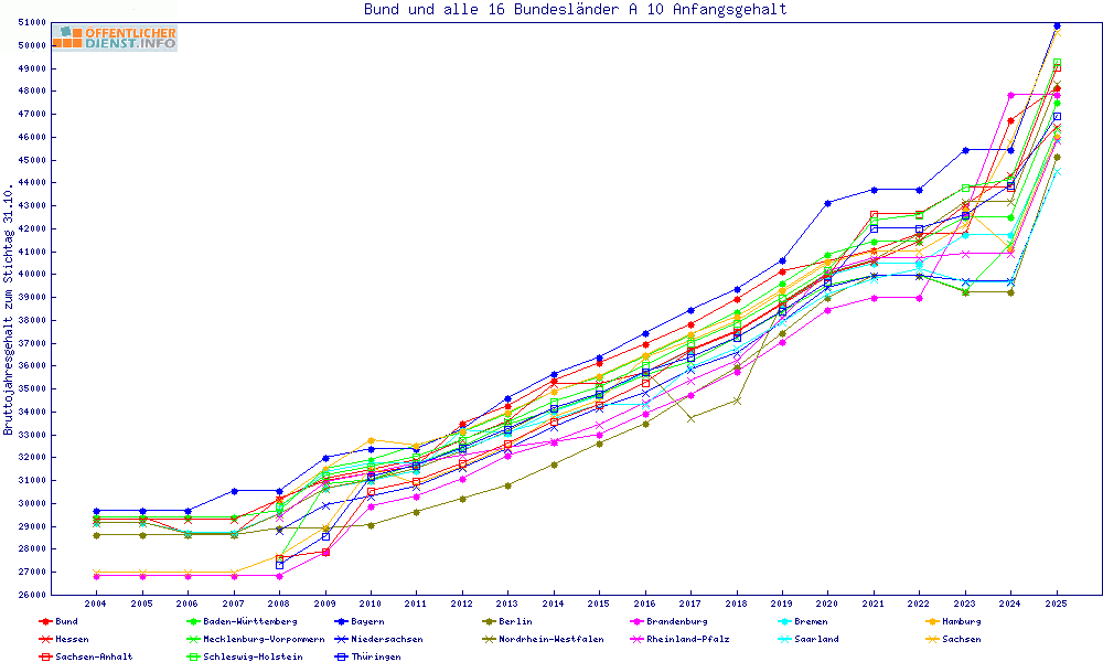 | Besoldungsvergleich A 10 im Jahr 2025 | Anfangsgehalt | ||||||