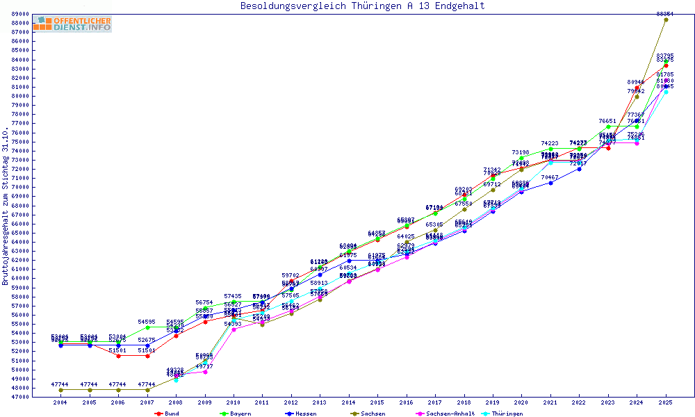 | Sachsen | 88.355 € | +7909 € | +9.8% | +8265 € | +10.3% | 28 Jahre | ||