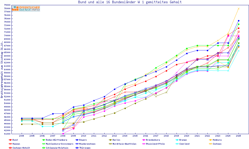 | Besoldungsvergleich W 1 im Jahr 2025 | gemitteltes Gehalt | ||||||