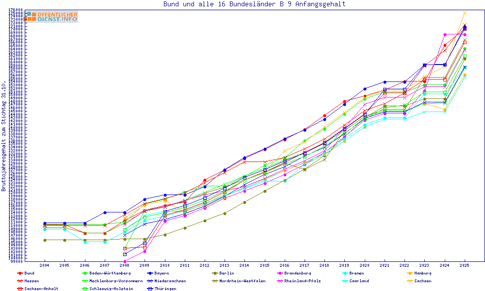 | Besoldungsvergleich B 9 im Jahr 2025 | Anfangsgehalt | ||||||