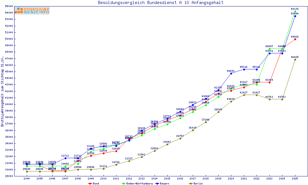 | Besoldungsvergleich A 10 im Jahr 2025 | Anfangsgehalt | ||||||