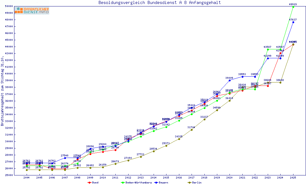 | Besoldungsvergleich A 8 im Jahr 2025 | Anfangsgehalt | ||||||