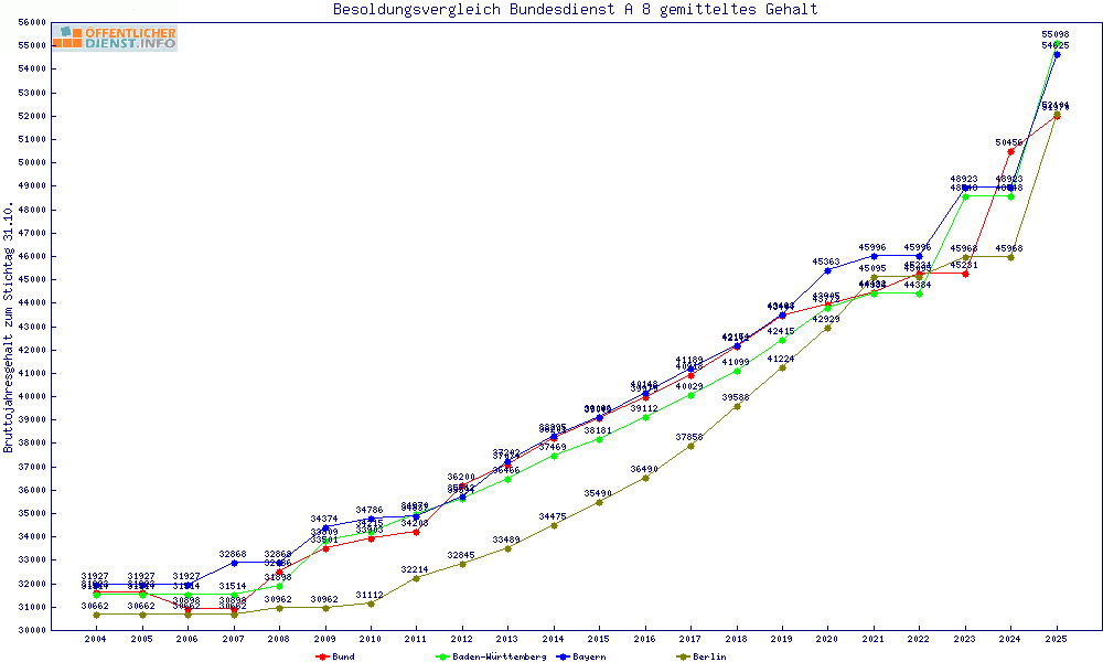 | Besoldungsvergleich A 8 im Jahr 2025 | gemitteltes Gehalt | ||||||
