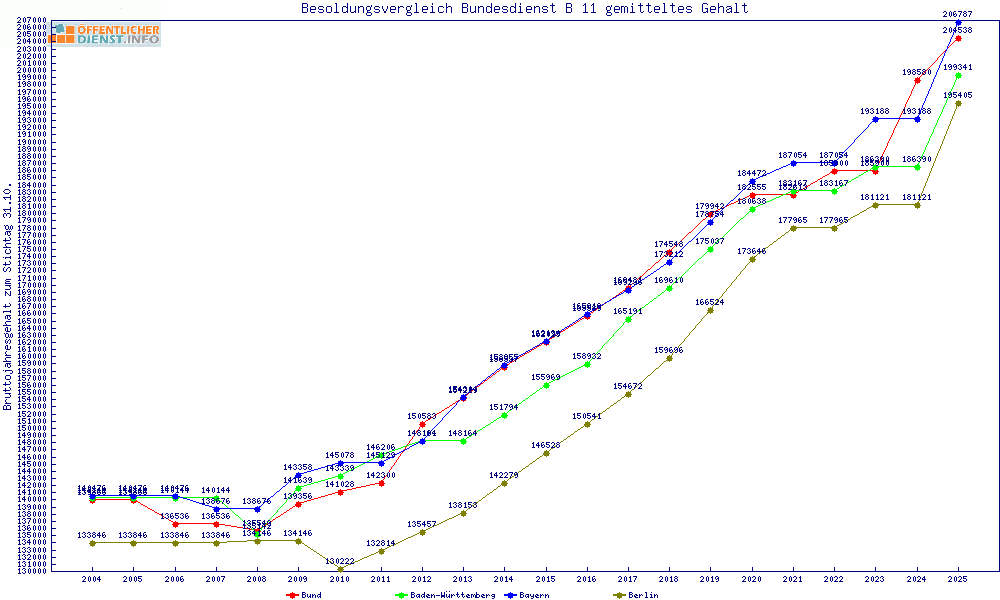 | Besoldungsvergleich B 11 im Jahr 2025 | gemitteltes Gehalt | ||||||