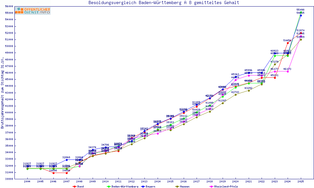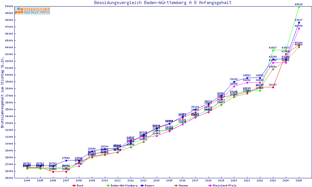 | Besoldungsvergleich A 8 im Jahr 2025 | Anfangsgehalt | ||||||