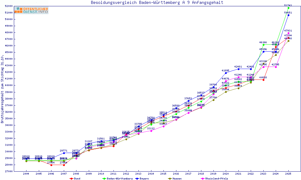 | Besoldungsvergleich A 9 im Jahr 2025 | Anfangsgehalt | ||||||
