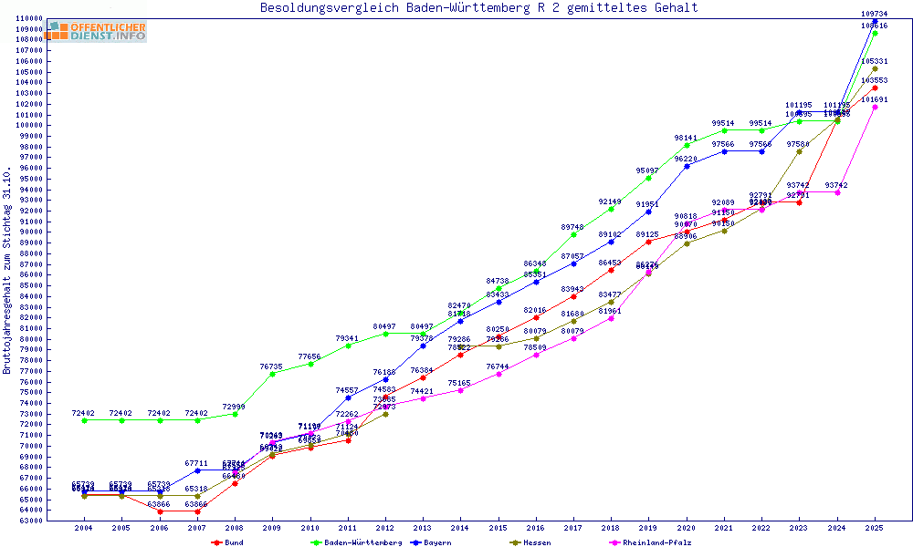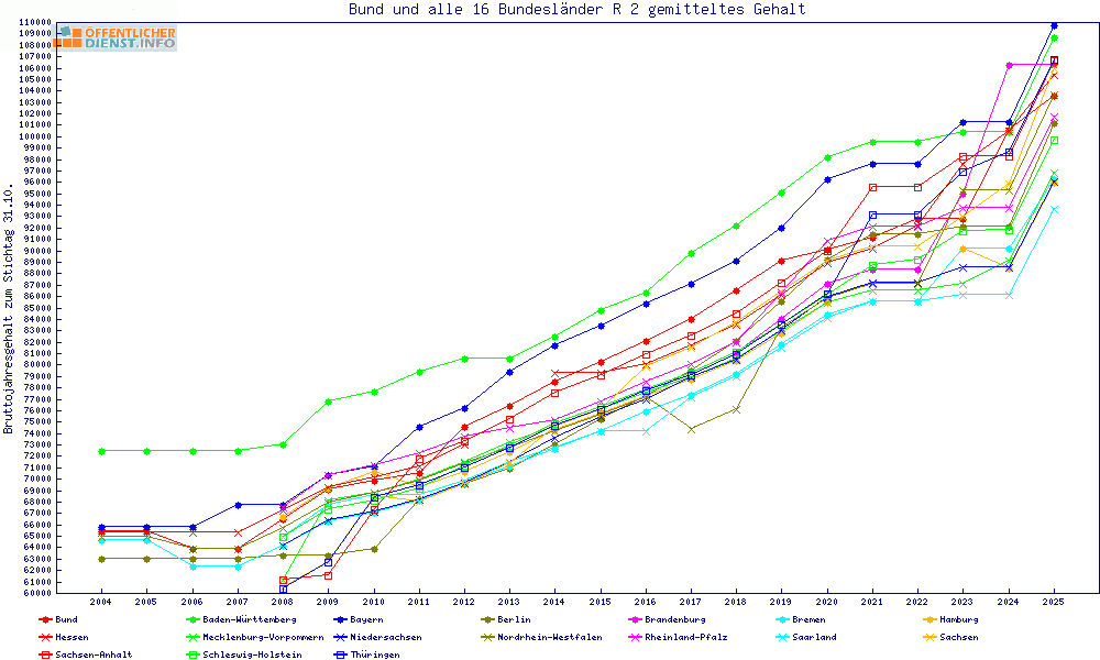 | Besoldungsvergleich R 2 im Jahr 2025 | gemitteltes Gehalt | ||||||