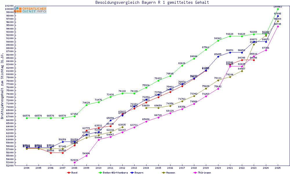 | Besoldungsvergleich R 1 im Jahr 2025 | gemitteltes Gehalt | ||||||