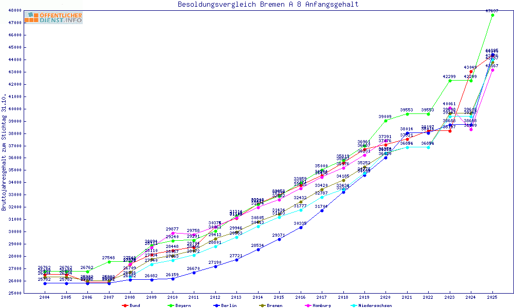 | Besoldungsvergleich A 8 im Jahr 2025 | Anfangsgehalt | ||||||