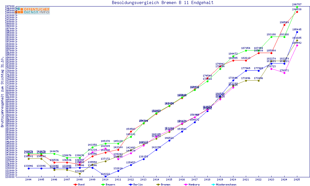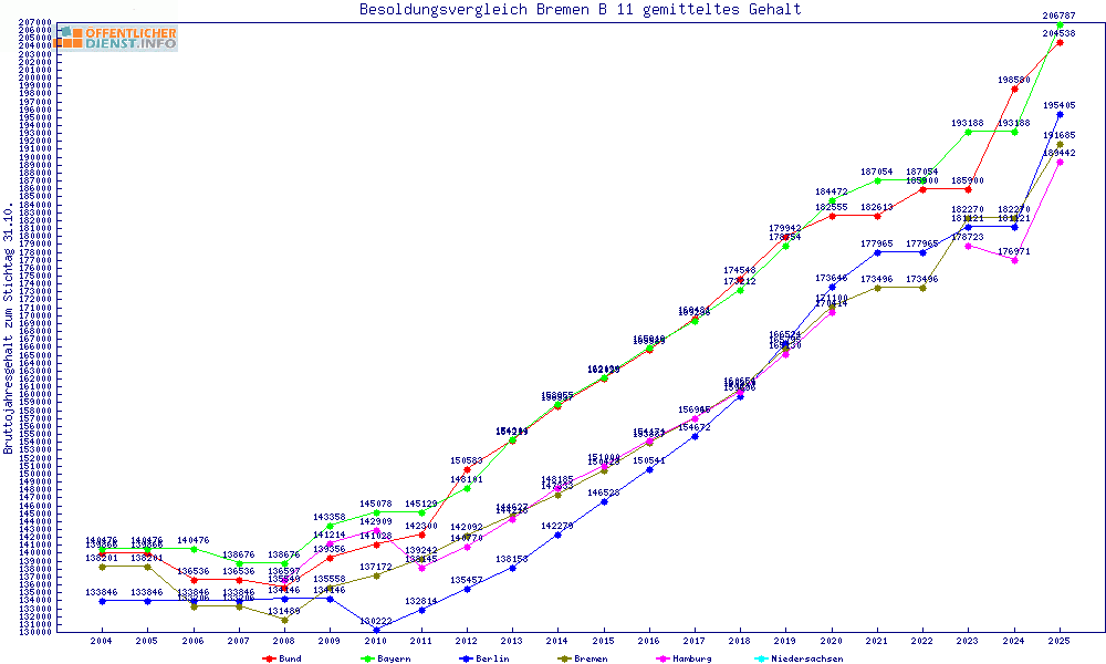 | Besoldungsvergleich B 11 im Jahr 2025 | gemitteltes Gehalt | ||||||