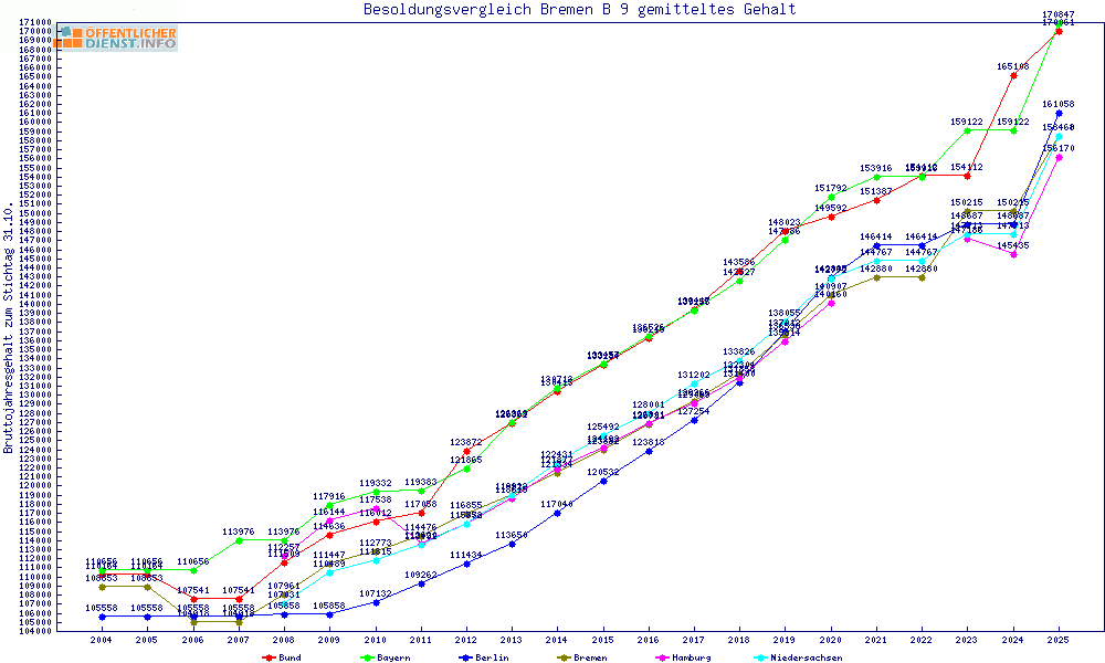| Besoldungsvergleich B 9 im Jahr 2025 | gemitteltes Gehalt | ||||||