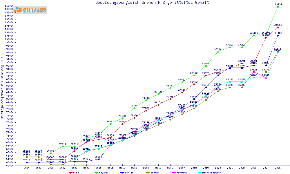 | Besoldungsvergleich R 2 im Jahr 2025 | gemitteltes Gehalt | ||||||
