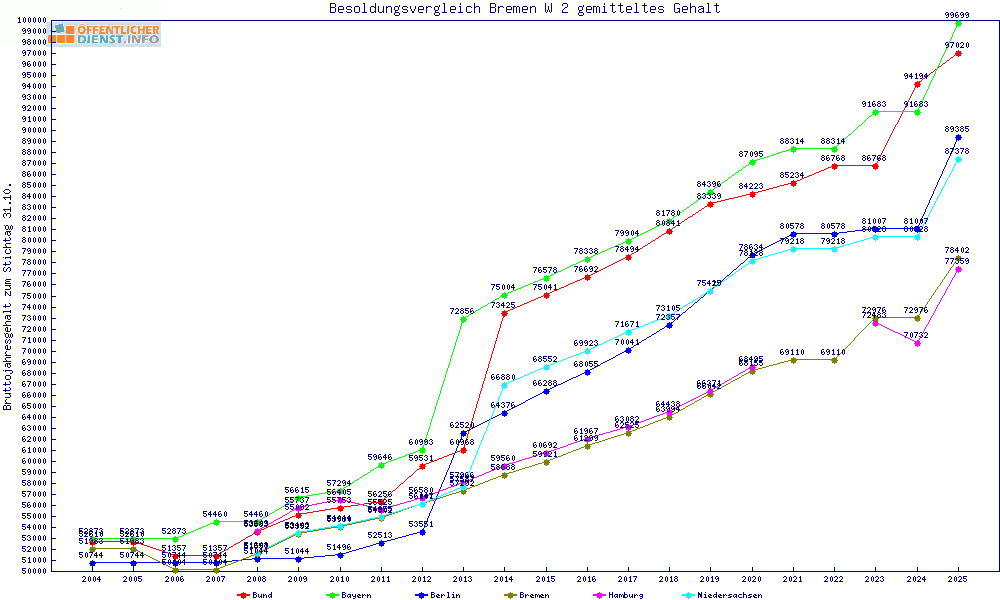 | Besoldungsvergleich W 2 im Jahr 2025 | gemitteltes Gehalt | ||||||