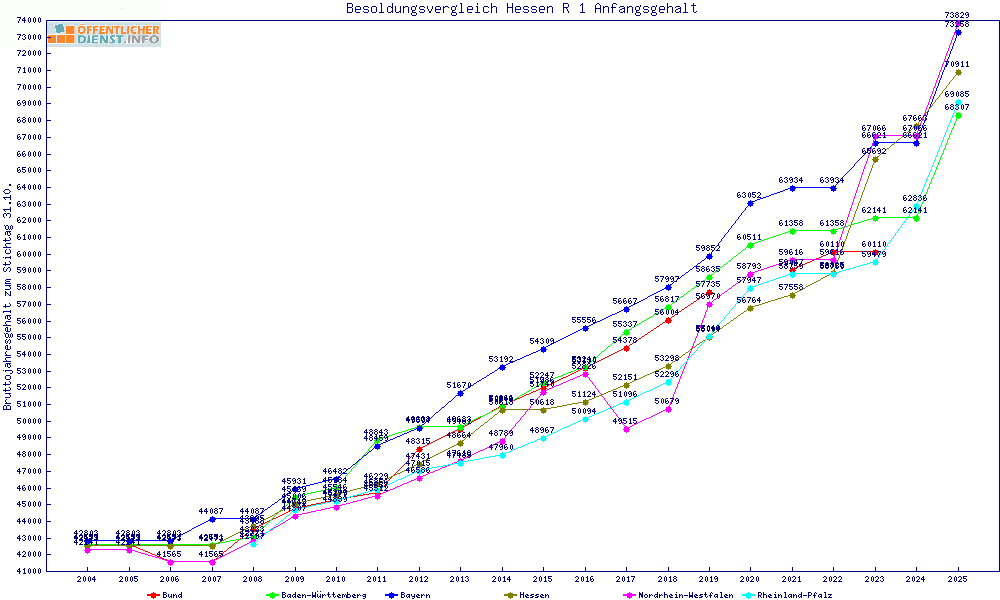 | Besoldungsvergleich R 1 im Jahr 2025 | Anfangsgehalt | ||||||