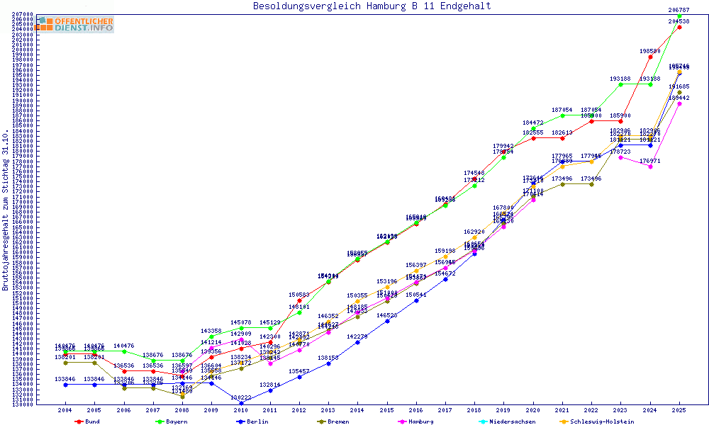 | Besoldungsvergleich B 11 im Jahr 2025 | gemitteltes Gehalt | ||||||