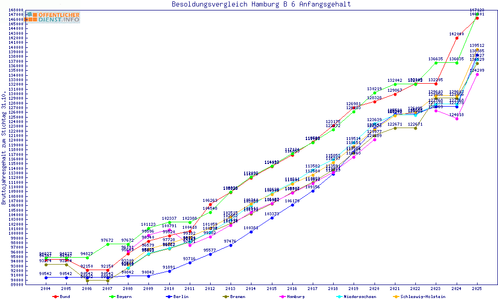 | Besoldungsvergleich B 6 im Jahr 2025 | Anfangsgehalt | ||||||