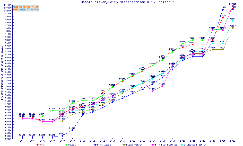 | Besoldungsvergleich A 15 im Jahr 2025 | Anfangsgehalt | ||||||