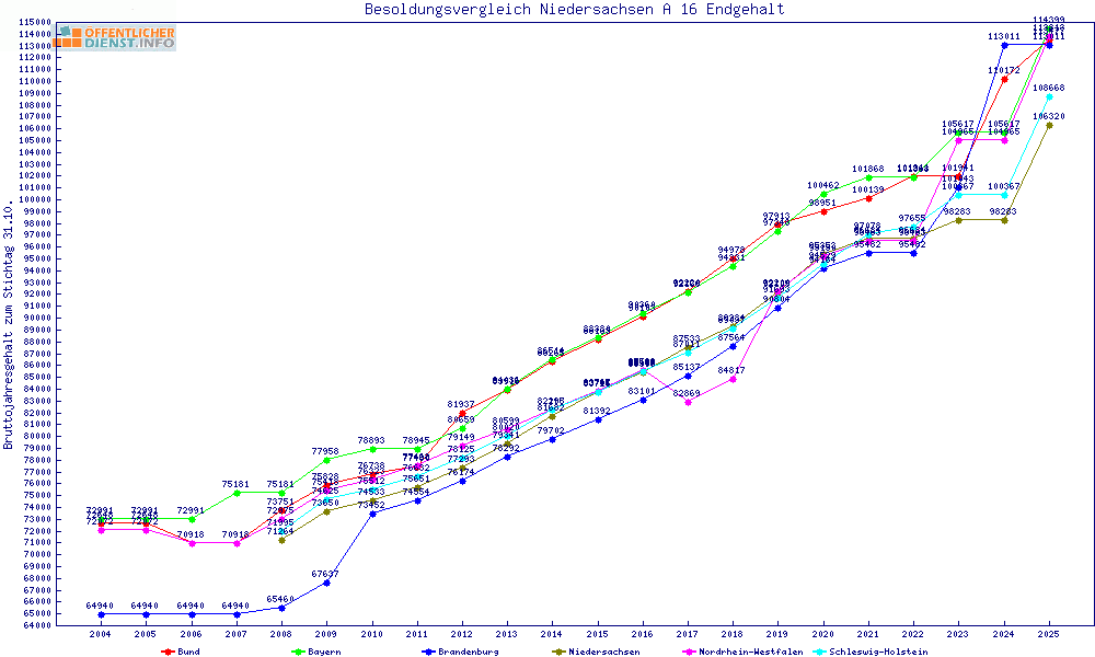 | Besoldungsvergleich A 16 im Jahr 2025 | Anfangsgehalt | ||||||