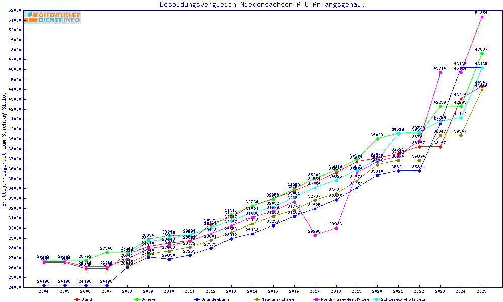 | Besoldungsvergleich A 8 im Jahr 2025 | Anfangsgehalt | ||||||