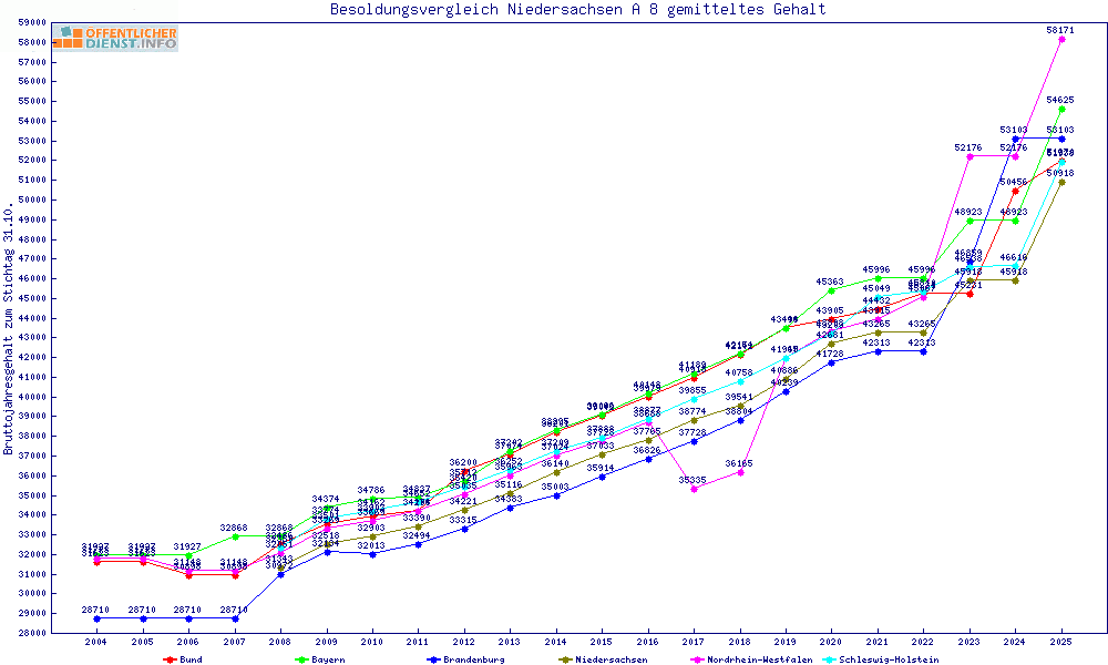 | Besoldungsvergleich A 8 im Jahr 2025 | gemitteltes Gehalt | ||||||
