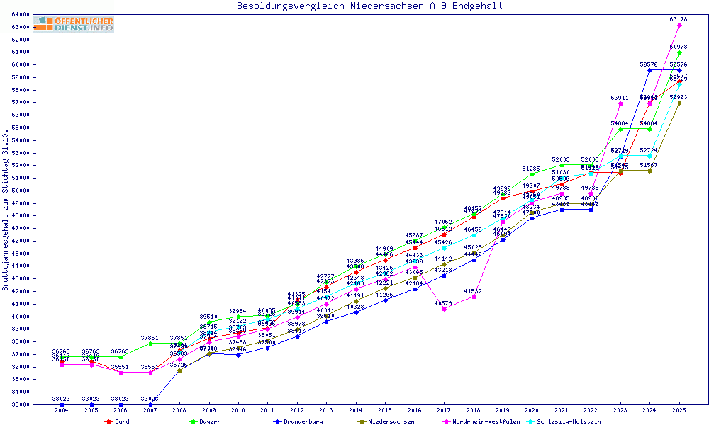 | Besoldungsvergleich A 9 im Jahr 2025 | Anfangsgehalt | ||||||