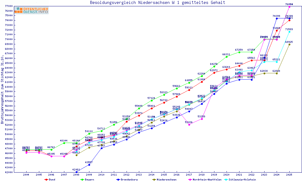 | Besoldungsvergleich W 1 im Jahr 2025 | gemitteltes Gehalt | ||||||