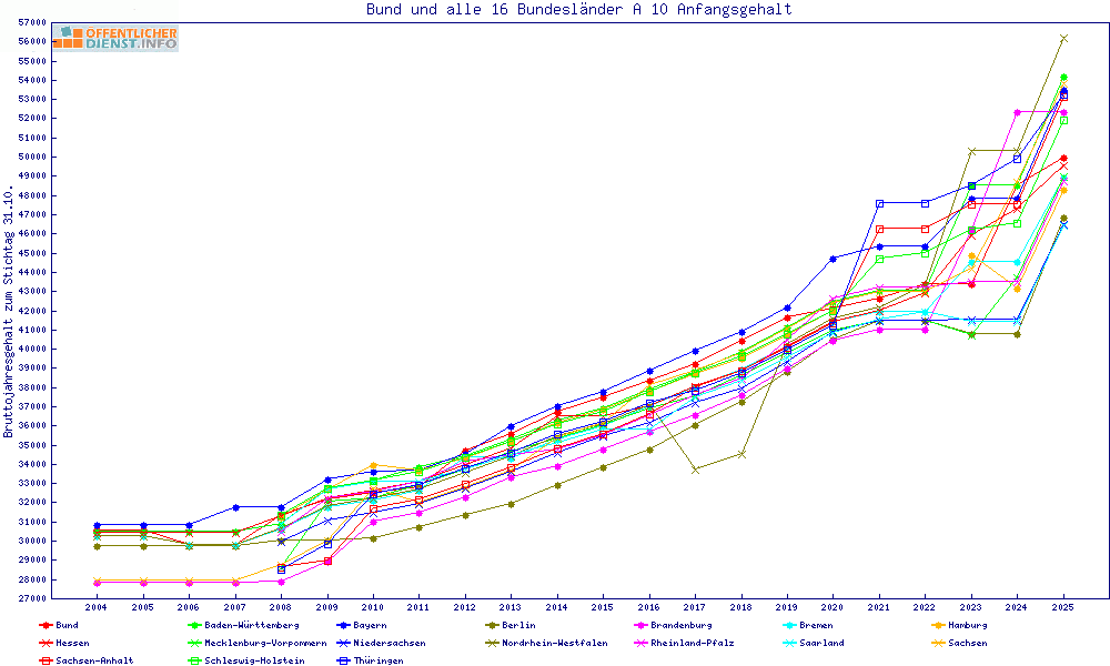 | Besoldungsvergleich A 10 im Jahr 2025 | Anfangsgehalt | ||||||