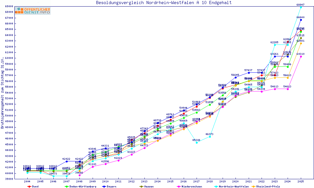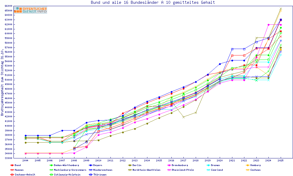 | Besoldungsvergleich A 10 im Jahr 2025 | gemitteltes Gehalt | ||||||