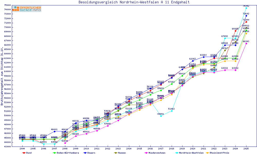 | Nordrhein-Westfalen | 74.342 € | +4381 € | +6.3% | 28 Jahre | ||||
