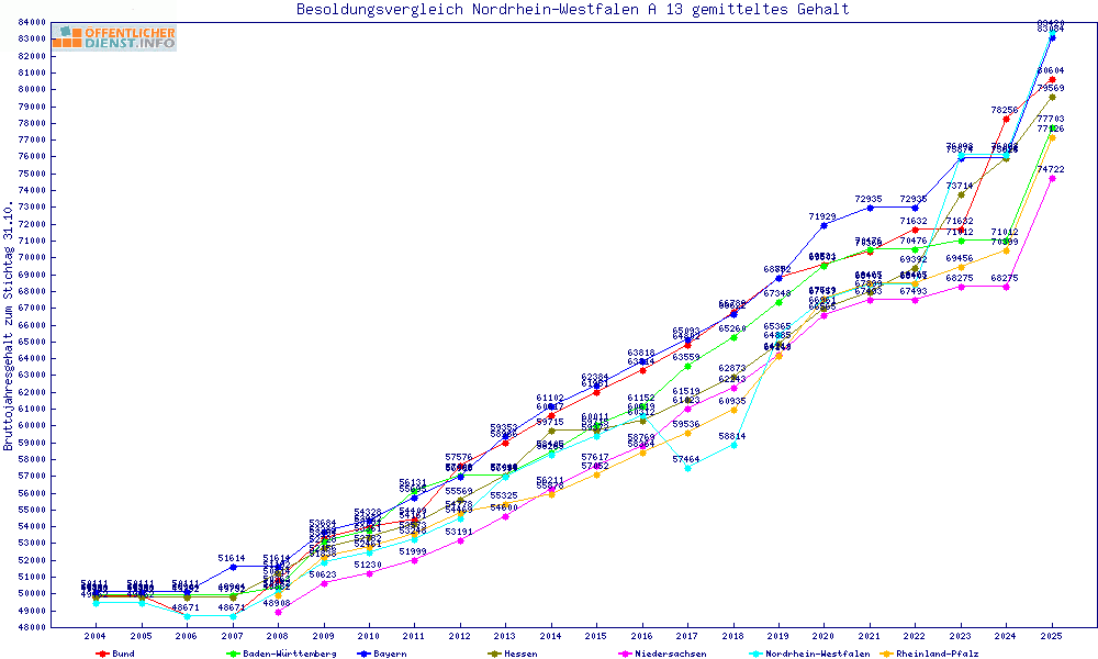 | Besoldungsvergleich A 13 im Jahr 2025 | gemitteltes Gehalt | ||||||