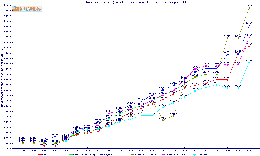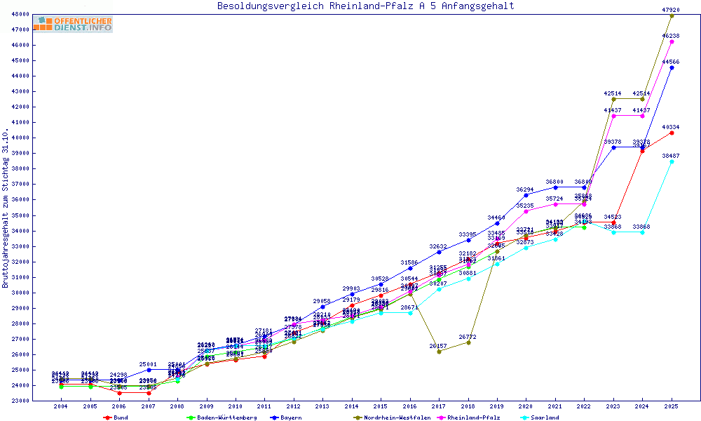 | Rheinland-Pfalz | 47.985 € | +368 € | +0.8% | 22 Jahre | ||||