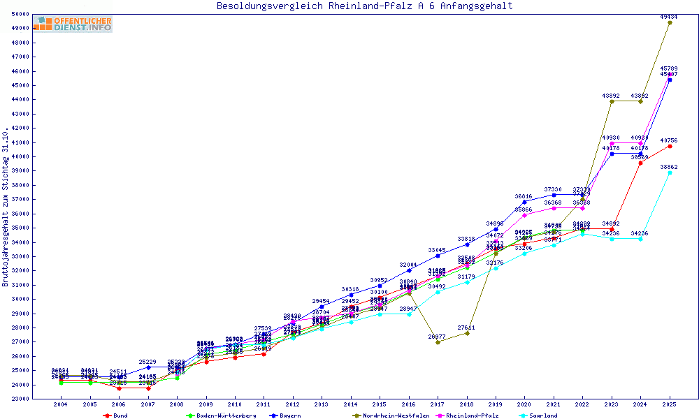 | Rheinland-Pfalz | 49.487 € | +270 € | +0.5% | 22 Jahre | ||||