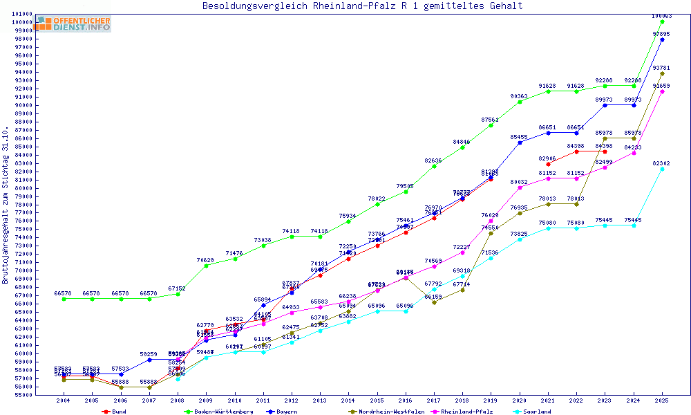 | Besoldungsvergleich R 1 im Jahr 2025 | gemitteltes Gehalt | ||||||