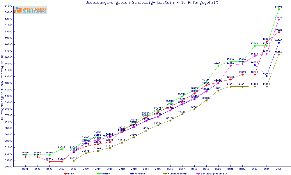 | Besoldungsvergleich A 10 im Jahr 2025 | Anfangsgehalt | ||||||