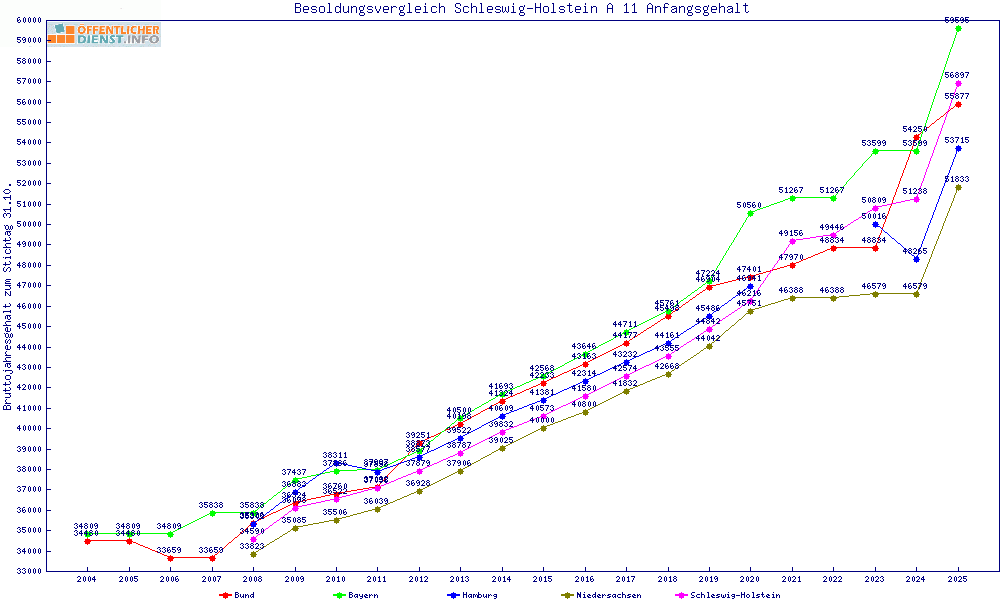 | Besoldungsvergleich A 11 im Jahr 2025 | Anfangsgehalt | ||||||
