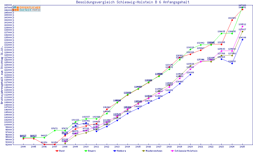 | Besoldungsvergleich B 6 im Jahr 2025 | Anfangsgehalt | ||||||