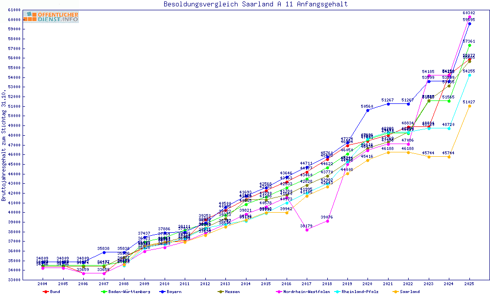 | Besoldungsvergleich A 11 im Jahr 2025 | Anfangsgehalt | ||||||