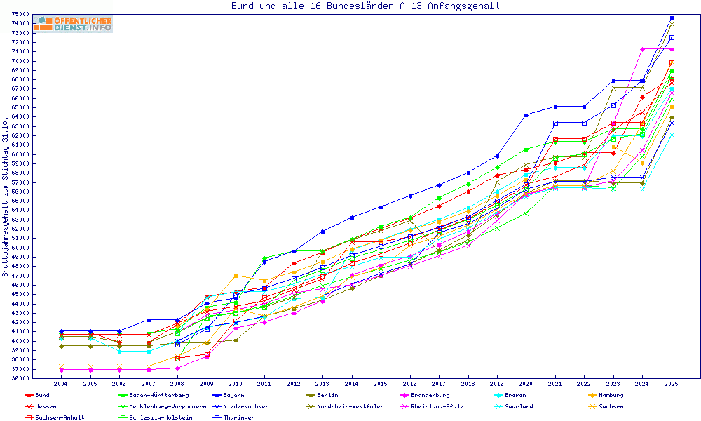 | Besoldungsvergleich A 13 im Jahr 2025 | Anfangsgehalt | ||||||