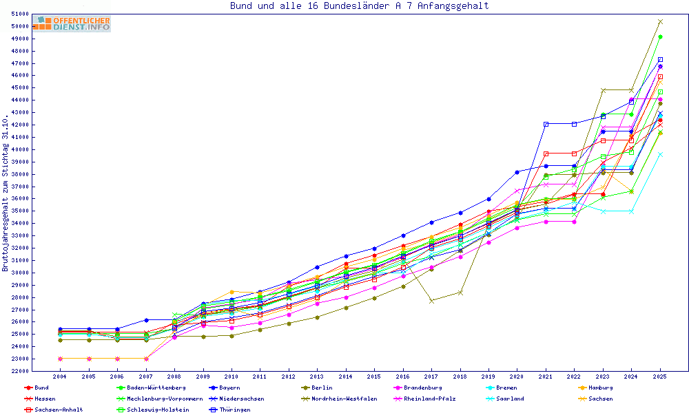 | Besoldungsvergleich A 7 im Jahr 2025 | Anfangsgehalt | ||||||