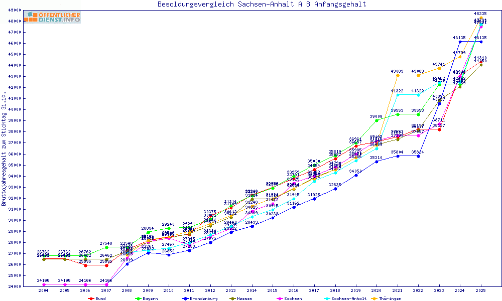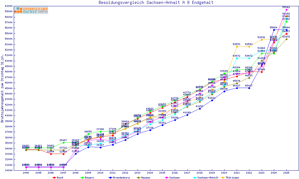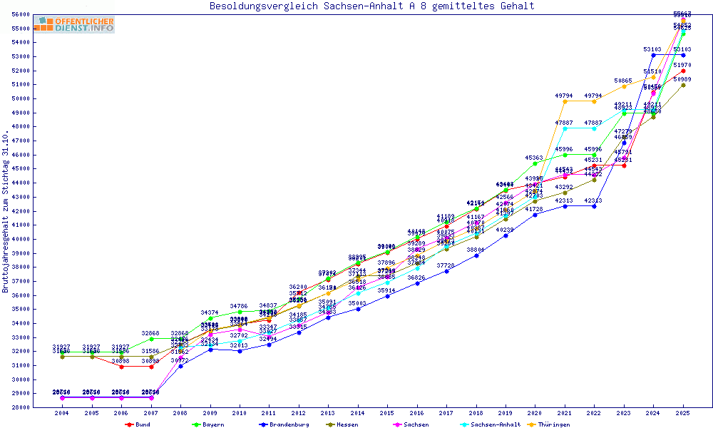 | Sachsen-Anhalt | 57.655 € | +2322 € | +4.2% | 23 Jahre | ||||