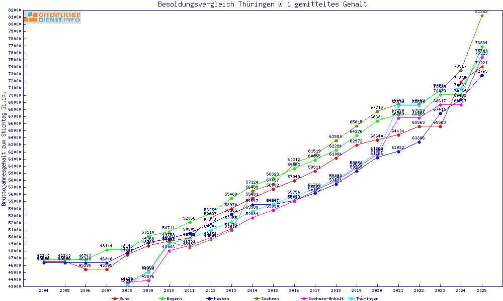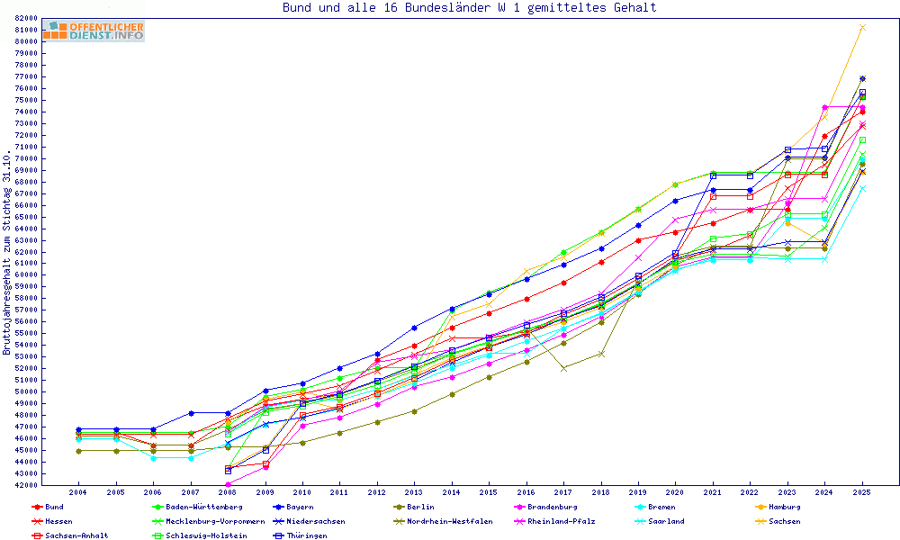 | Besoldungsvergleich W 1 im Jahr 2025 | gemitteltes Gehalt | ||||||