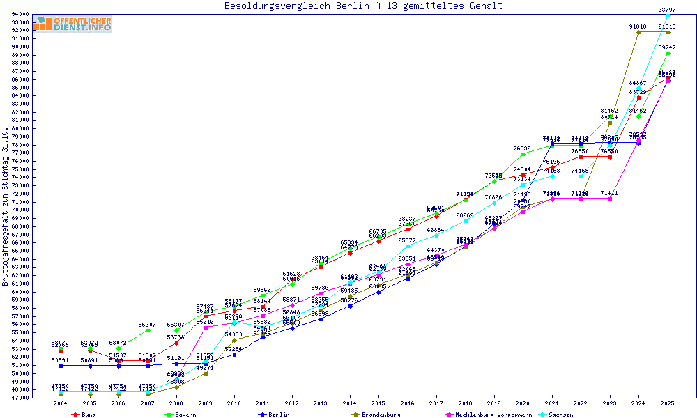 | Besoldungsvergleich A 13 im Jahr 2025 | gemitteltes Gehalt | ||||||