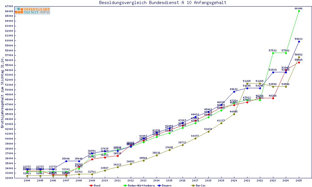 | Besoldungsvergleich A 10 im Jahr 2025 | Anfangsgehalt | ||||||